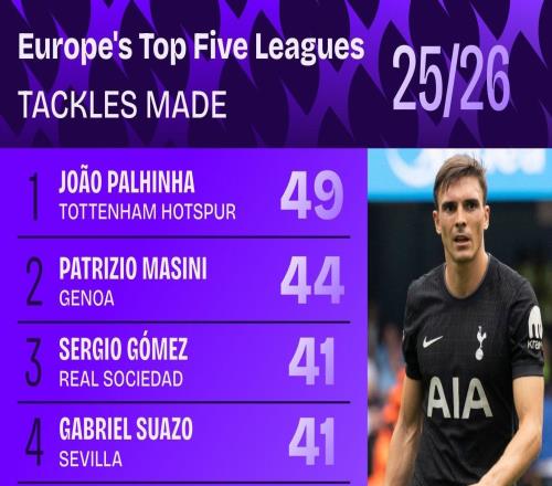 北京时间11月21日,知名数据机构Squawka统计出了2025-26赛季欧洲五大联赛的球员抢断榜,托特纳姆热刺的中场球星...